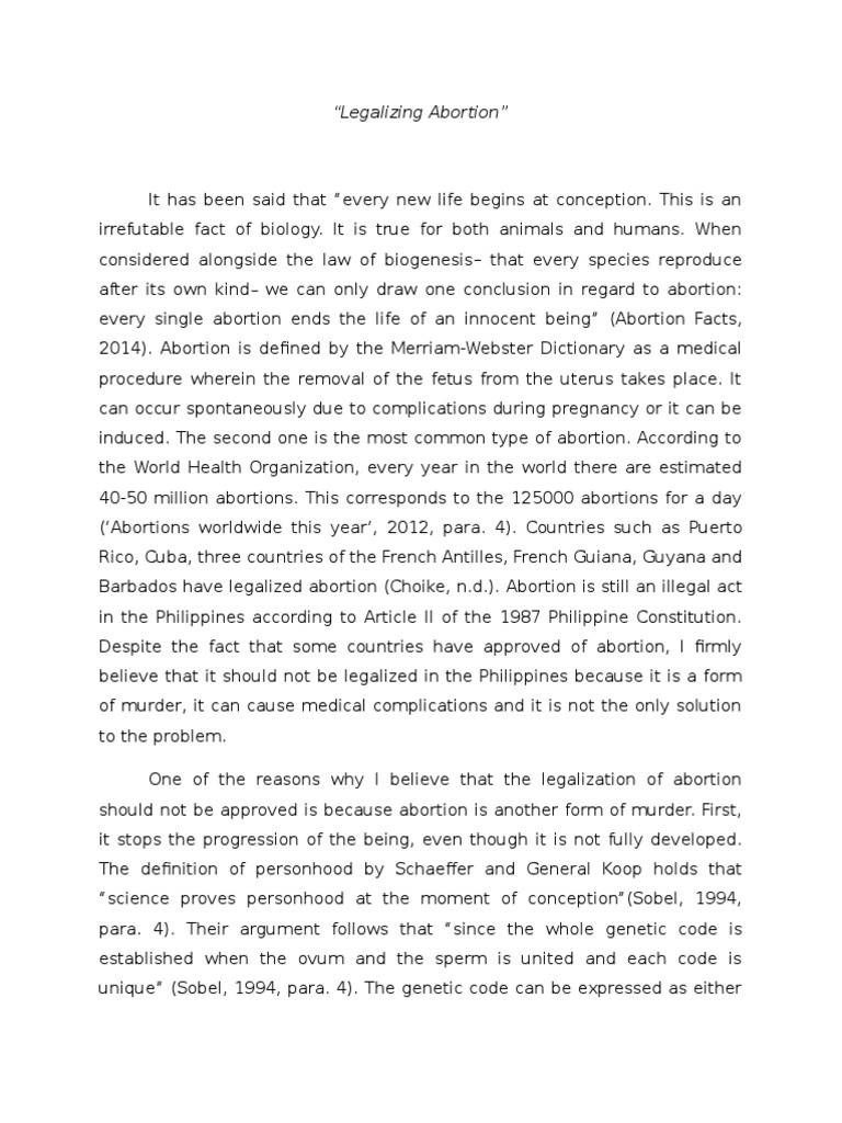 · Abortion means the early removal of a human fetus, whether impulsively as in a miscarriage or unnaturally caused by surgical or chemical abortion. As of today, the most general usage of this term abortion stands for the artificially caused abortion. A Abortion Essay example. Words5 Pages. Abortion is defined as the termination of a pregnancy before the fetus is capable of independent life. Abortions must be conducted before the end of six months or the fetus will leave the womb and it would be considered premature birth. If the fetus weighs less than 18 ounces or is less than 20 weeks into pregnancy, it is usually considered an abortion · The conclusion paragraph of this abortion essay constitutes of three main parts. The first part restates the main premises: The decision to terminate a pregnancy should generally lie with pregnant women. The second part presents 1 – 2 sentences which summarizes the arguments that support my thesis. And lastly my personal blogger.comted Reading Time: 8 mins