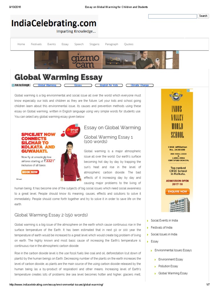 He is indeed correct about this, as well as the global warming essay for students that it may be a consequence of human activity. Statistics like these tend to lead people the wrong way, convincing them that global warming is taking a huge toll on our planet and that something must be done. The attention that global warming gained has raised the awareness of thousands across the country to be more aware of how they are individually effecting the environment, which in turn has helped the environment.